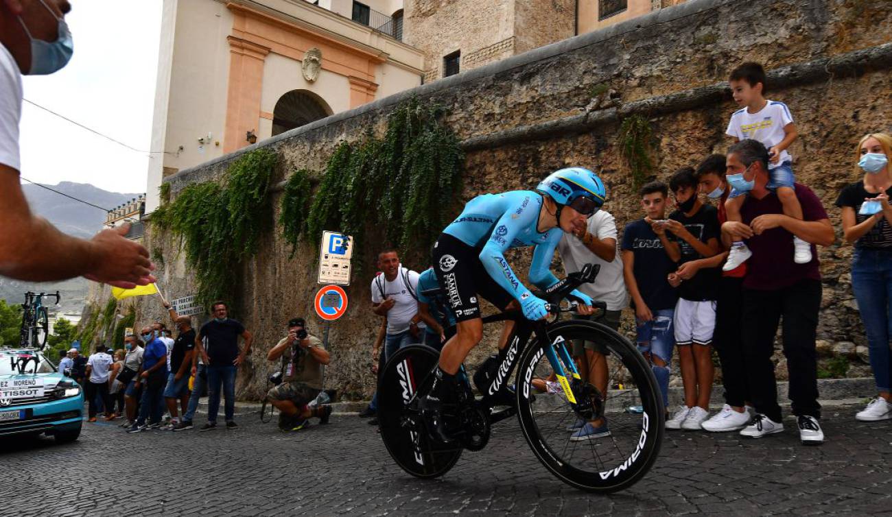 El colombiano Miguel Ángel López (Astana) cayó este sábado en pleno esprint tras resbalarse en un bache en la carretera que le llevaba a la línea de meta en Palermo, en la contrarreloj individual que abrió la 103 edición del Giro de Italia.