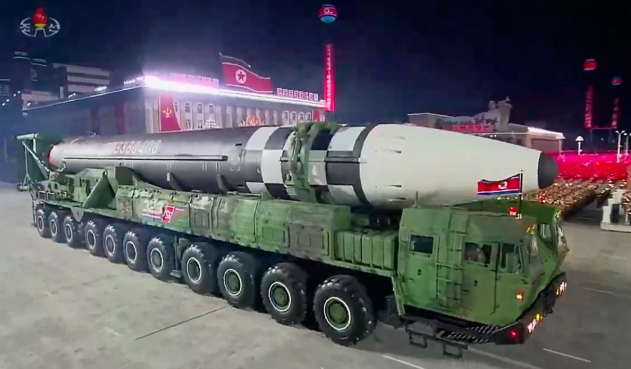 El sábado, el misil estaba colocado en un vehículo de 11 ejes, lo nunca visto hasta ahora. El modelo es mucho más grande que el de los vehículos de ocho ejes fabricados en China que el Norte suele utilizar.