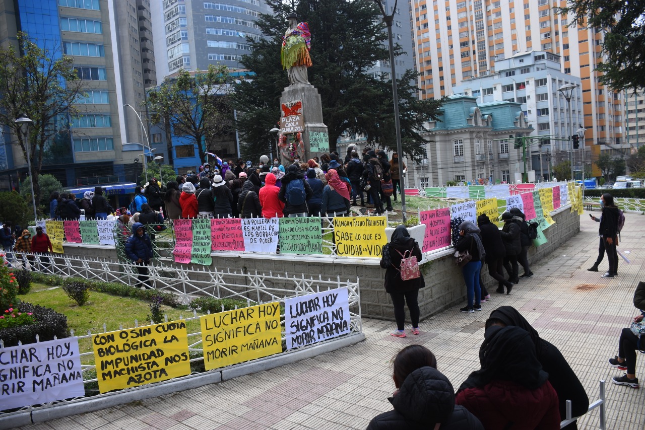 Las manifestantes colocaron un cartel que decía «Plaza Chola Globalizada» para protestar la supuesta imposición de «estándares de belleza europeos», explicaron las participantes.