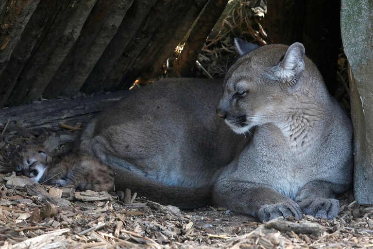 Los adultos suelen pesar entre 90 y 200 libras. Los machos y las hembras se aparean brevemente para la reproducción, pero la hembra cría a los cachorros sola. Los cachorros permanecen con la hembra hasta que tienen aproximadamente un año y medio, momento en el que se dispersan para encontrar sus propios territorios. Los pumas son animales solitarios. Suelen cazar solos al amanecer y al atardecer.