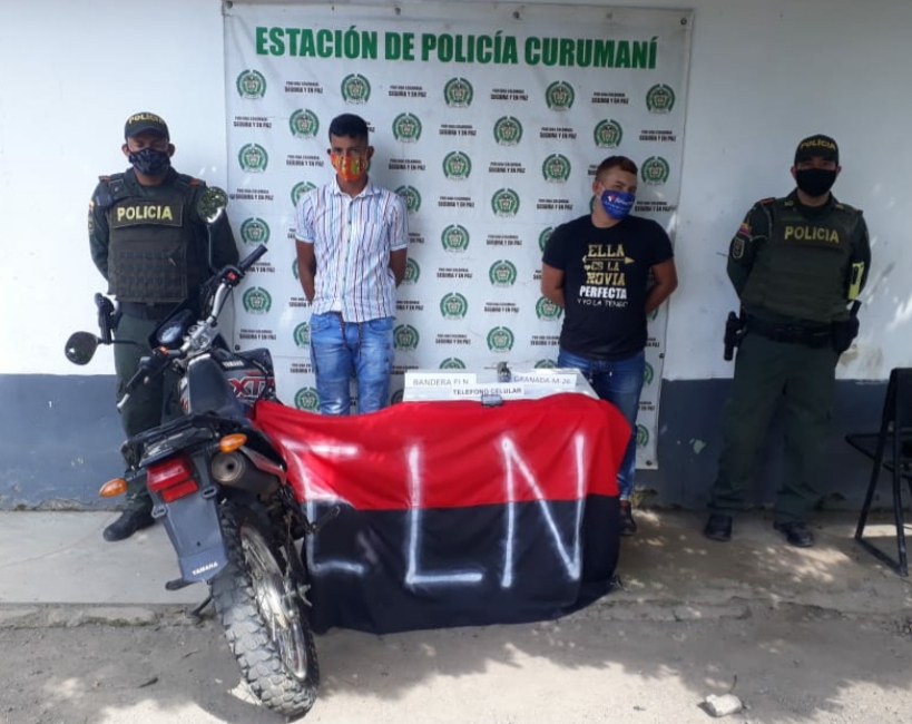 De acuerdo con la Policía estos sujetos se movilizaban en una motocicleta en la vía que comunica al municipio de Curumaní con San Roque, portando una bandera alusiva al Eln, además de tener en su poder una granada de fragmentación.