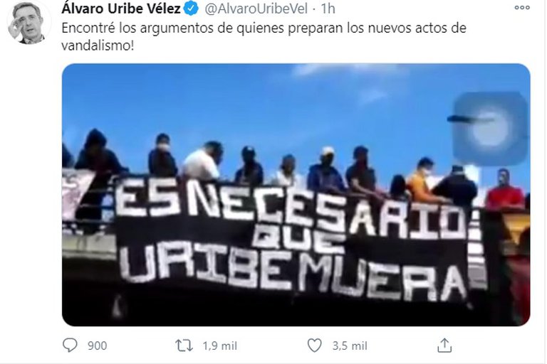 Este lunes, a través de un mensaje en Twitter, el exmandatario se pronunció frente a la foto de la valla, que es viral en la red social desde ayer. “Encontré los argumentos de quienes preparan los nuevos actos de vandalismo”, publicó Uribe, junto a la imagen de la pancarta, a falta de dos días para la jornada del paro nacional convocada por las centrales sindicales obreras, a las que se ha unido la Minga y el partido de las Farc.