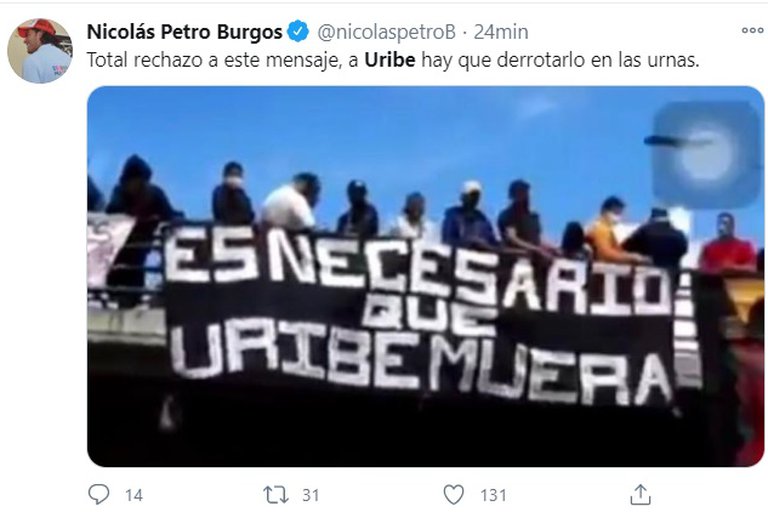 En contraste con retuit de Gustavo Petro de la imagen con la pancarta, sobresale el mensaje de su hijo, Nicolás, diputado, quien además de rechazarla, manifestó: “A Uribe hay que derrotarlo en las urnas”.