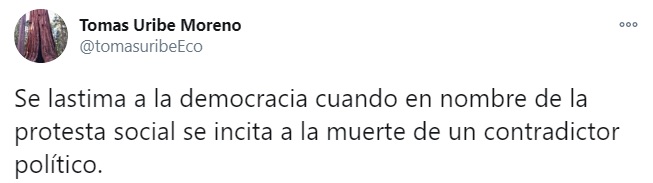 Tomás, uno de los hijos del exsenador Uribe, escribió en su cuenta de esta red social que “se lastima a la democracia cuando en nombre de la protesta social se incita a la muerte de un contradictor político”
