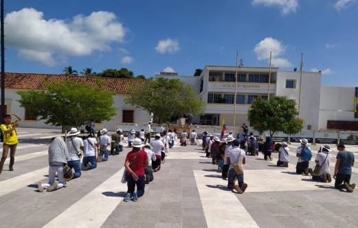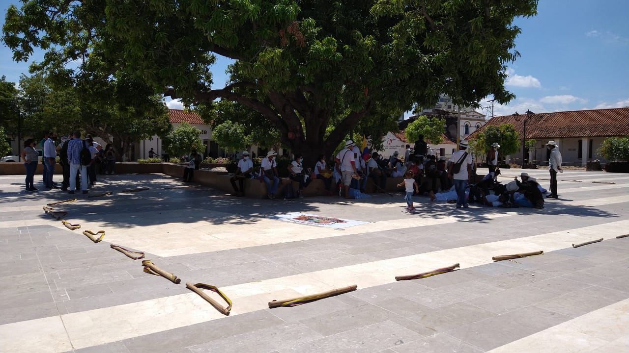 Desde el corregimiento de Río Seco, en peregrinación llegaron a la plaza Alfonso López pasadas las 10:00 de la mañana, y aunque durante los últimos días levantaron su voz para exigir atención, esta vez la protesta es simbólica, en silencio, y hasta delimitaron un espacio alrededor del emblemático palo de mango, pidiendo respeto a sus creencias y tradiciones.