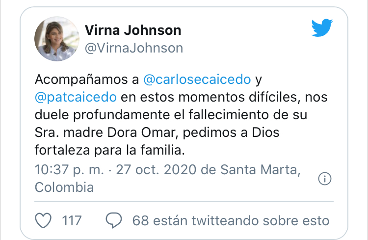 La alcaldesa de Santa Marta, Virna Johnson, envió un mensaje de condolencias. “Acompañamos a Carlos Caicedo y Patricia Caicedo en estos momentos difíciles, nos duele profundamente el fallecimiento de su Sra. madre Dora Omar, pedimos a Dios fortaleza para la familia”.