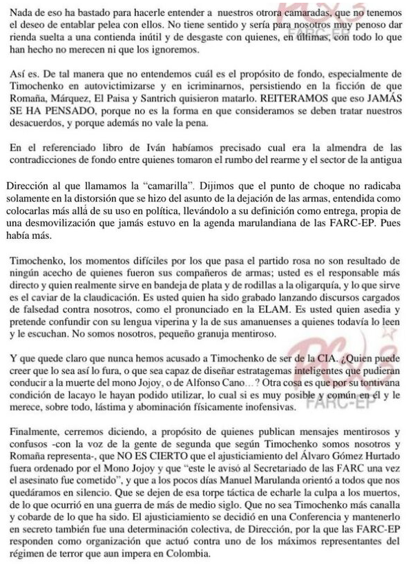 «Reiteramos que esto jamás se ha pensado porque no es la forma en que consideramos se deben tratar nuestros desacuerdos, y porque además no vale la pena. A ‘Timochenko’, nadie en las Farc-EP Segunda Marquetalia, ha querido, ni quiere matarle», precisa.