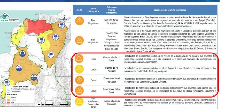 El IDEAM recomendó especial atención al río Guatapurí, a la altura del corregimiento de Chemesquemena”, en jurisdicción de Valledupar, así como en los municipios de Pueblo Bello y El Copey, donde hay Alerta Roja por probabilidad de incrementos súbitos en el río Guatapurí y sus afluentes. De igual manera recomendó especial atención a los municipios de La Jagua de Ibirico, Chiriguaná, Curumaní y Chimichagua por el posible incremento del caudal en la cuenca baja del río Cesar.