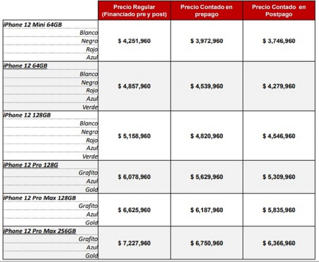 El más barato es el iPhone 12 Mini, que en su presentación de 64 GB estará un poco por debajo de los 4 millones de pesos y en la de mayor capacidad tendrá un valor cercano a los 4,6 millones de pesos. Por su parte, el iPhone 12 oscilará entre los 4,5 y los 5,3 millones de pesos.