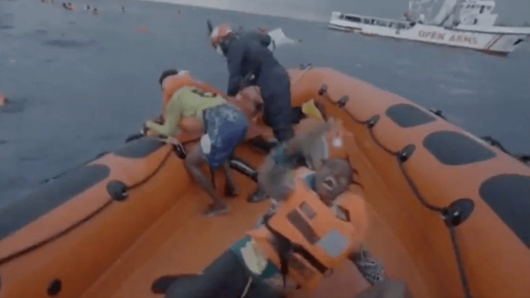 Los socorristas de Open Arms consiguieron llevar a bordo a las 111 personas que habían caído al mar y recuperar los cuerpos de cinco inmigrantes que fallecieron ahogados y también los subieron a bordo.