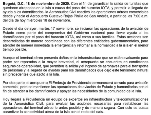 Las operaciones del aeropuerto internacional de San Andrés se suspendieron en la madrugada del 16 de noviembre «para preteger a los viajeros y al personal de la terminal, teniendo en cuenta las difíciles comndiciones meteorológicas originadas por el huracán Iota», subraya.