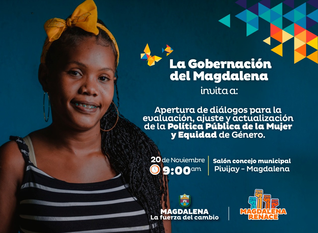 La Gobernación del Magdalena a través de la Oficina de Atención a la Mujer, Equidad de Género e Inclusión Social, encabeza de la licenciada Karlina Sánchez Marmolejo, dará apertura este 20 de noviembre a las 9:00 AM a los Diálogos para la Evaluación, Ajustes y Actualización de la Política Pública de Mujer y Equidad de Género en el Departamento.