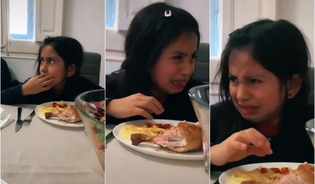Mientras el sujeto habla, la niña lo observa y escucha asombrada. Pero es justamente cuando está masticando una papa francesa, que entiende que se quedará sin regalos y comienza a llorar con un desconsuelo enternecedor, como si no pudiera creer su mala suerte.