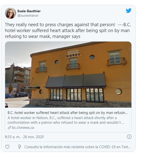 Indignante. Trabajadora de un hotel en Canadá estuvo a punto de morir tras sufrir un infarto y todo por un cliente que llegó negándose a usar tapabocas.