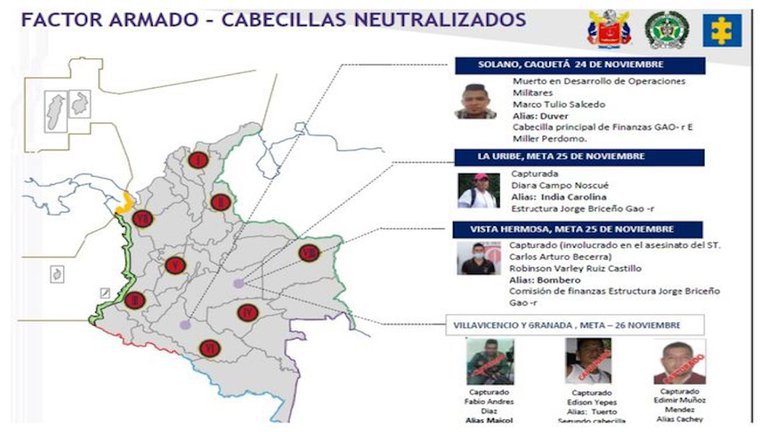 Por otro lado, el pasado jueves 26 de noviembre se anunció la captura de tres presuntos miembros de disidencias de las Farc que estarían operando en el departamento de Meta.