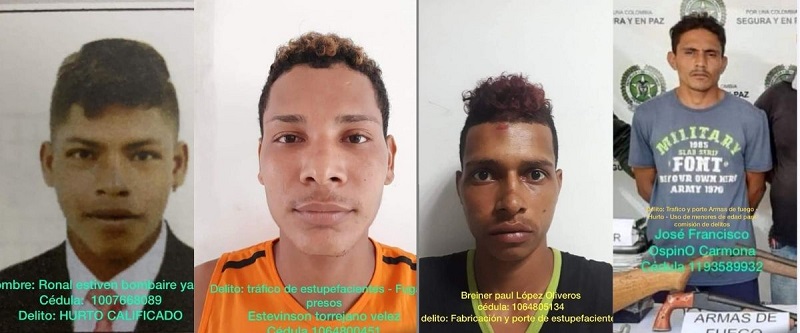 Los prófugos de la justicia son: Estivenson Torrejano Vélez, Breiner Paul López Oliveros,José Francisco Opinó Carmona, Ronal Estiven López Olivera y Jhon Anderson Nava Torres, señalados de los delitos de hurto calificado agravado, porte de arma de fuego, porte y tráfico de estupefacientes y uso de menores de edad para la comisión de delitos.