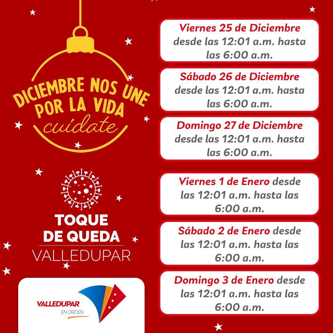 La Alcaldía de Valledupar mediante Decreto Nº 000823 del 18 de diciembre de 2020, dispuso la medida transitoria de toque de queda en todo el municipio en el marco de las festividades navideñas y de fin de año.