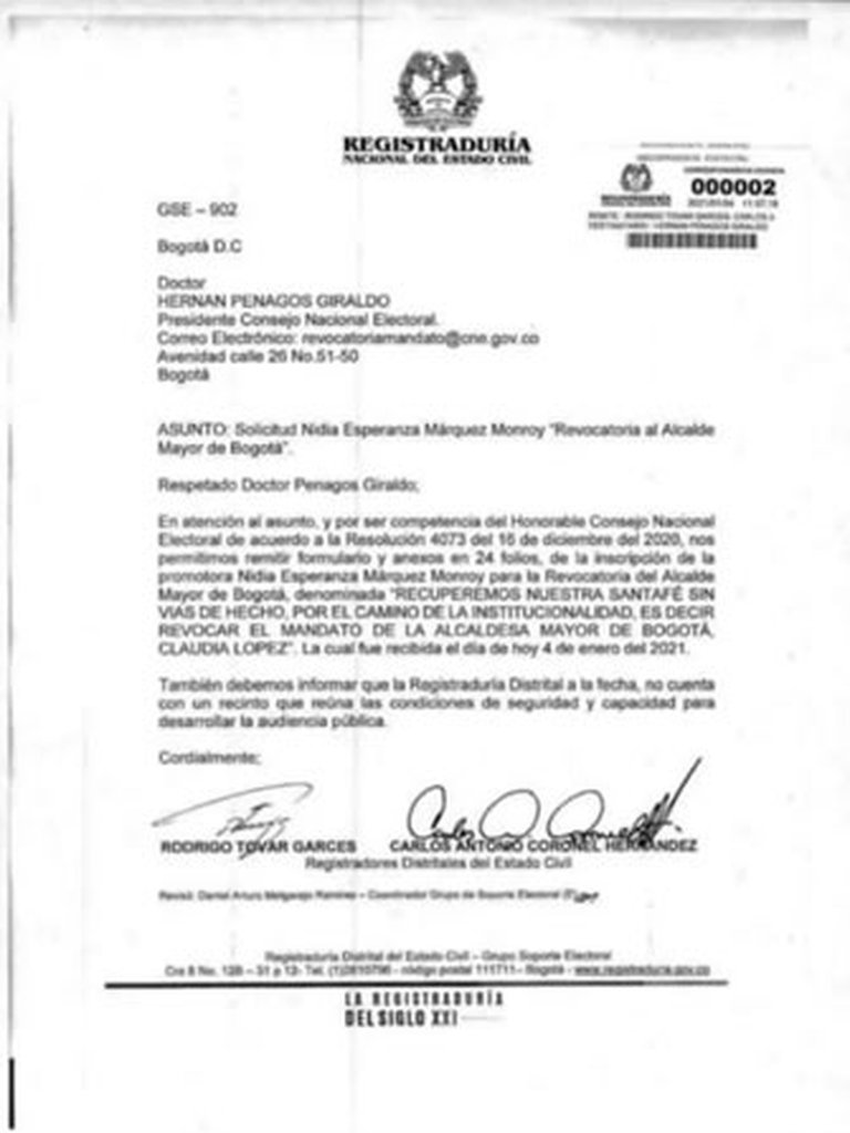 De acuerdo con lo informado por el noticiero CM&, el pasado 4 de enero, fue radicada una solicitud por parte de dicho comité, el cual expresó: “De acuerdo a la Resolución 4073 del 16 de diciembre del 2020, nos permitimos remitir formulario y anexos en 24 folios, de la inscripción de la promotora Nidia Esperanza Márquez Monroy para la Revocatoria del Alcalde Mayor de Bogotá, denominada ‘Recuperemos nuestra Santafé sin vías de hecho, por el camino de la institucionalidad, es decir revocar el mandato de la alcaldesa mayor de Bogotá Claudia López”.