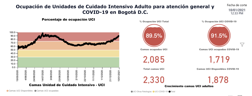 Con corte este 10 de enero había 1,719 habitantes de la capital colombiana internados en UCI, cifra que comparada con los reportes del día sábado (1,688) muestra un ingreso de más de 30 pacientes a Cuidados Intensivos en un solo día (entre sábado y domingo).