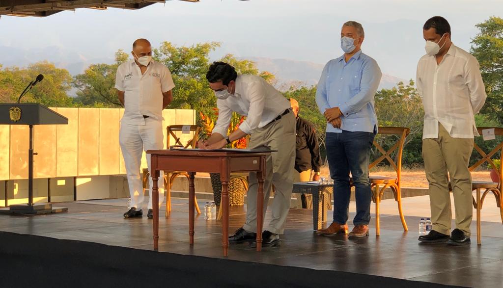 La firma se materializó durante la gira que el Presidente de la República cumplió ayer en el departamento del Cesar, y para lo cual estuvo acompañado del director del DNP, Luis Alberto Rodríguez; el Gobernador del Cesar, Luis Alberto Monsalvo Gnecco; Nemesio Roys Garzón, gobernador de La Guajira; el Alcalde de Valledupar, Mello Castro, y otros integrantes del Gobierno Nacional y autoridades del departamento.