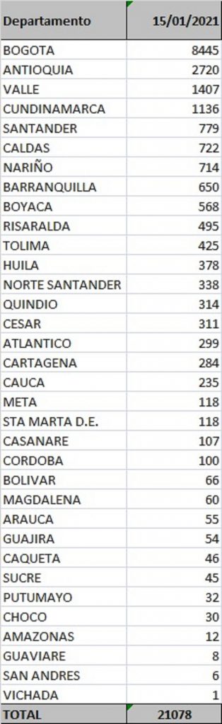 El Ministerio de Salud y Protección Social reportó, este viernes 15 de enero, 21.078 casos nuevos de coronavirus en Colombia. En las últimas 24 horas se procesaron 86.857 pruebas de las cuales 45.997 son PCR y 40.860 de antígenos.