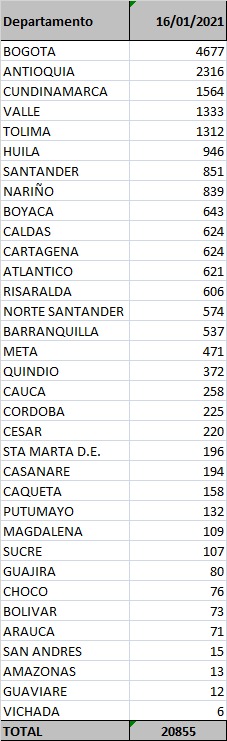 El Ministerio de Salud y Protección Social reportó, este sábado 16 de enero, 20.855 casos nuevos de coronavirus en Colombia. En las últimas 24 horas se procesaron 70.763 pruebas de las cuales 39.351 son PCR y 31.412 de antígenos.