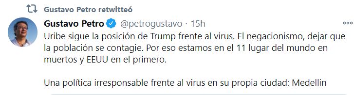 Ante esto el excandidato presidencial aseguró que este sigue la posición de Trump frente al virus. “El negacionismo, dejar que la población se contagie. Por eso estamos en el 11 lugar del mundo en muertos y EE.UU. en el primero. Una política irresponsable frente al virus en su propia ciudad: Medellín”, aseveró Petro. Pero a pesar de esto, los manifestantes llegaron desde las 4 p.m. a bloquear la Avenida San Juan, en el sector de la Alpujarra en Medellín.