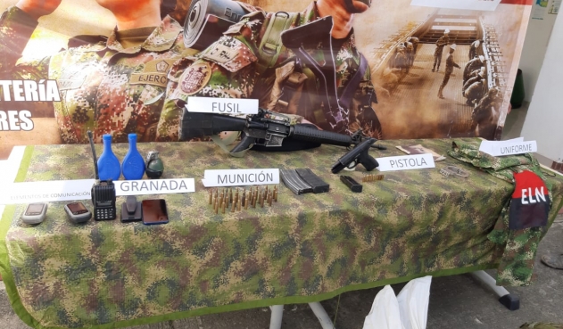 Tras el operativo, las autoridades incautaron un fusil M16, una pistola, una granada de mano, proveedores para fusil, 34 cartuchos, un radio de comunicaciones, dos geoposicionadores, un celular, un camuflado, unas esposas, un brazalete alusivo al ELN y material de intendencia.