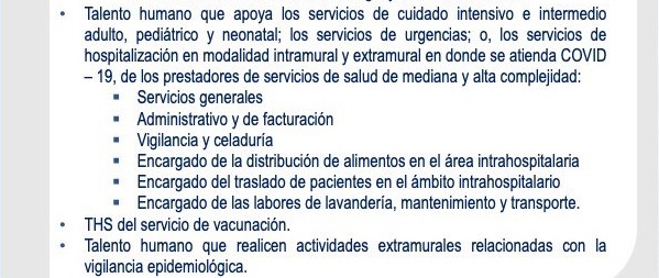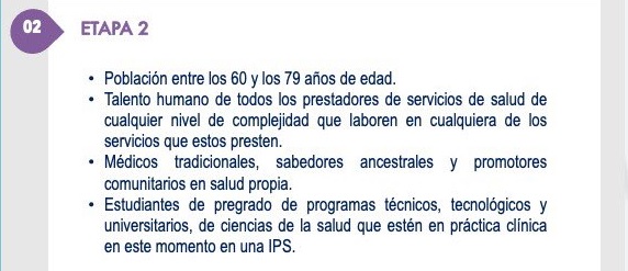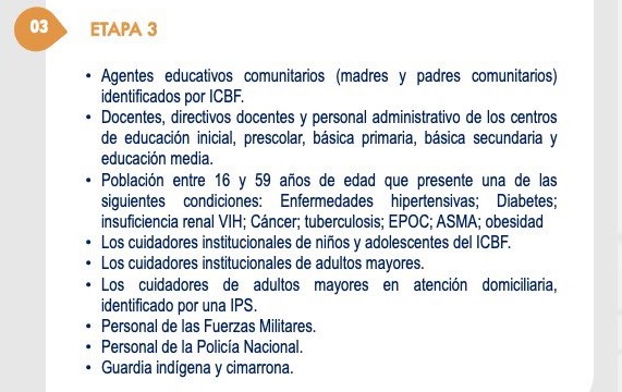 En la fase 2, que corresponde a las etapas 4 y 5, están los grupos como socorristas, población privada de la libertad, bomberos, talento humano de funerarias, cuidadores institucionales, algunos operadores de vuelos internacionales y guardias del INPEC.