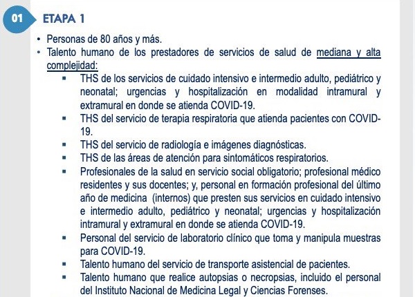 A continuación reseñamos las etapas que priorizan la población colombiana que será beneficiada en primera instancia con el plan de vacunación contra el Covid-19: