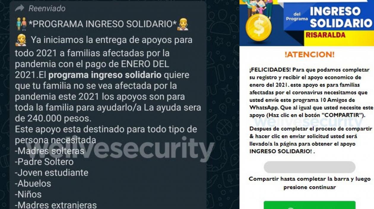 El engaño promete ser beneficiario del Ingreso Solidario, una ayuda monetaria como alivio por la pandemia que, si bien es una ayuda que genuinamente entrega el gobierno, el mensaje que circula a través de la aplicación de mensajería incluye un enlace que redirige a una página que no es oficial.