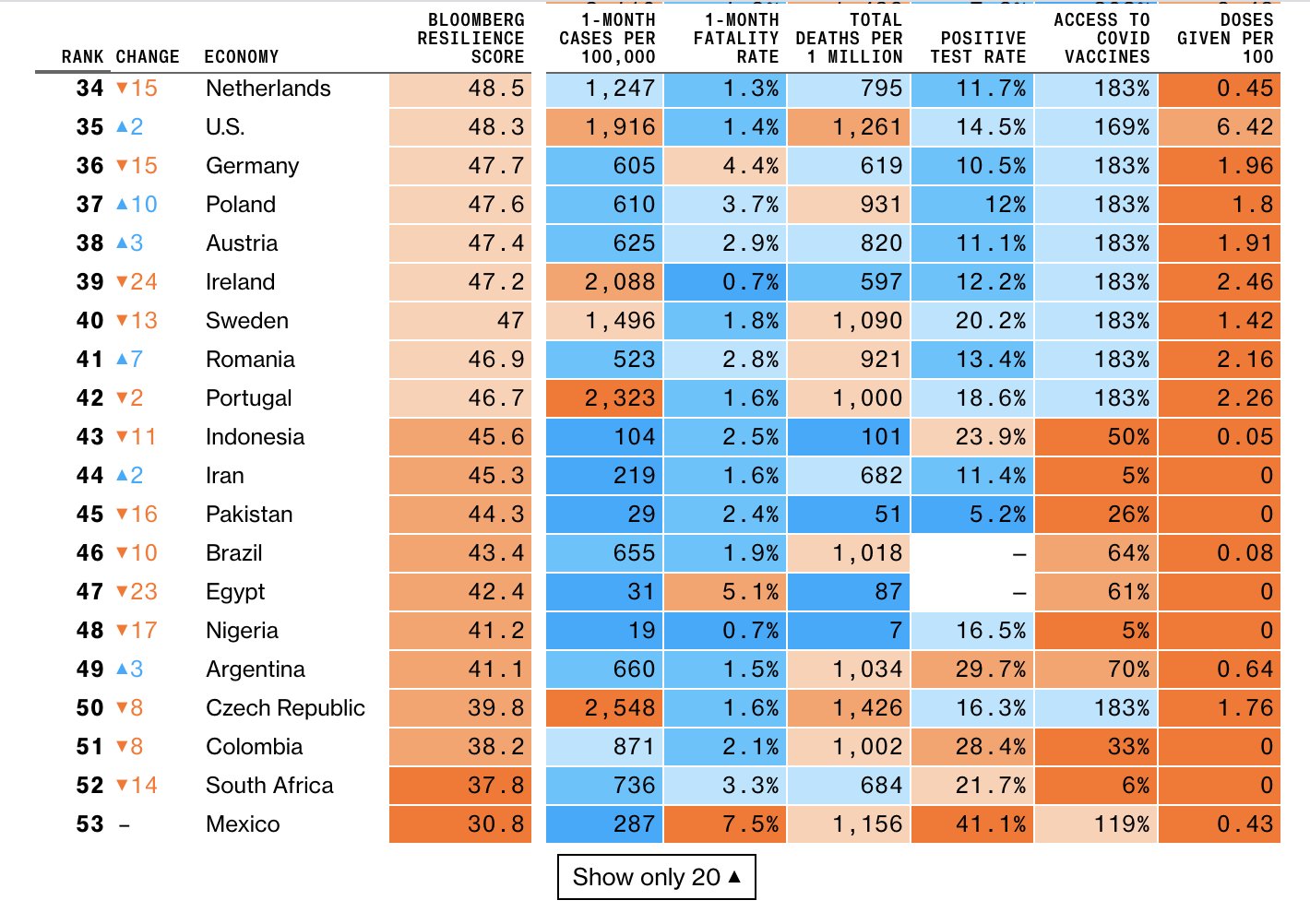 El siguiente trino muestra la tabla de posiciones de Bloomberg, con los últimos 20 con respecto de los 53 países más ricos del planeta y su manejo de la pandemia: