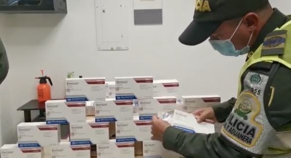 Gracias a los controles ejercidos por la POLFA, en las últimas horas se aprehendieron 27 cajas del antiviral REMDESIVIR, el medicamento que no está autorizado por el INVIMA para su uso en Colombia, tendría un costo de 18.000 dólares en el mercado negro y sería comercializado en el área metropolitana de Medellín.