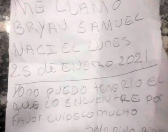 “Me llamo Bryan Samuel, nací el lunes 25 de enero de 2021. Yo no puedo tenerlo, el que lo encuentre por favor cuídelo mucho. Solo pido perdón”.