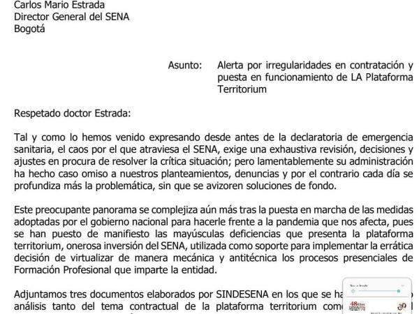 De hecho, Sindesena, el sindicato de la institución, le ha enviado varios informes a Estrada en los que le advierten que no entienden cómo se han hecho importantes erogaciones a pesar de “retrasos tempranos en la ejecución”, afectando tiempos y metas de formación virtual.