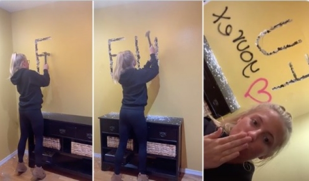 Pues fue la propia Ashley quien se gravó mientras escribía a martillazos un gigante mensaje en la pared de la vivienda de quien ahora es su expareja.