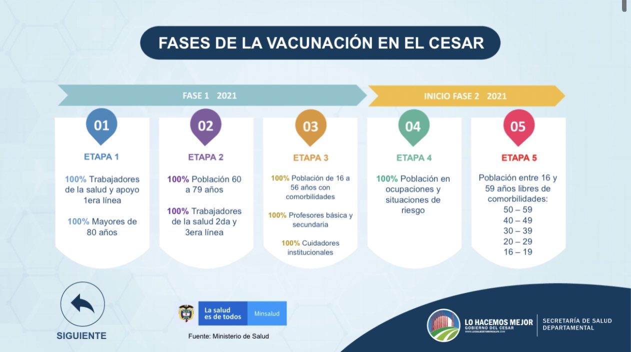 La vacunación se hará por etapas este año, siendo la inicial para trabajadores de la salud y apoyo de primera línea de atención covid-19; así como para mayores de 80 años, población dispersa; la segunda comprende a la población de 19 a 60 años y personal asistencial de segunda línea; la tercera para las personas entre 16 y 56 años con comorbilidades, y profesores de básica primaria y secundaria; la cuarta para cuidadores institucionales, población en ocupación y situaciones en riesgo, y la quinta para población entre 16 y 59 años libre de comorbilidades.