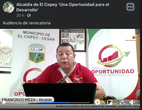 Lo peor del asunto es que la audiencia de revocatoria fue transmitida por la cuenta de Facebook de la Alcaldía de El Copey.