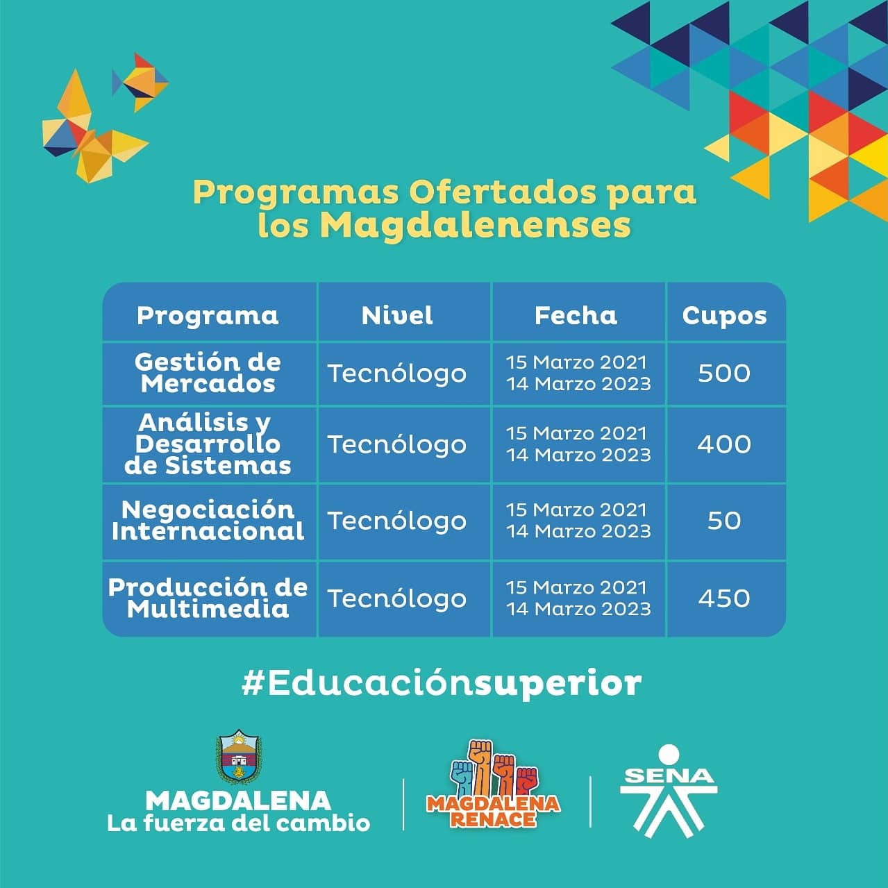 “El Sena tiene previsto adelantar en todo el país a través de sus 117 Centros de Formación una oferta virtual en las modalidades de técnicos y tecnólogos abierta, a la que podrían aplicar los magdalenenses. Es nuestro interés institucional brindar a la administración que usted lidera aportes significativos a la ejecución del Plan de Desarrollo ‘Magdalena Renace’”, precisó el Director del Sena Regional.