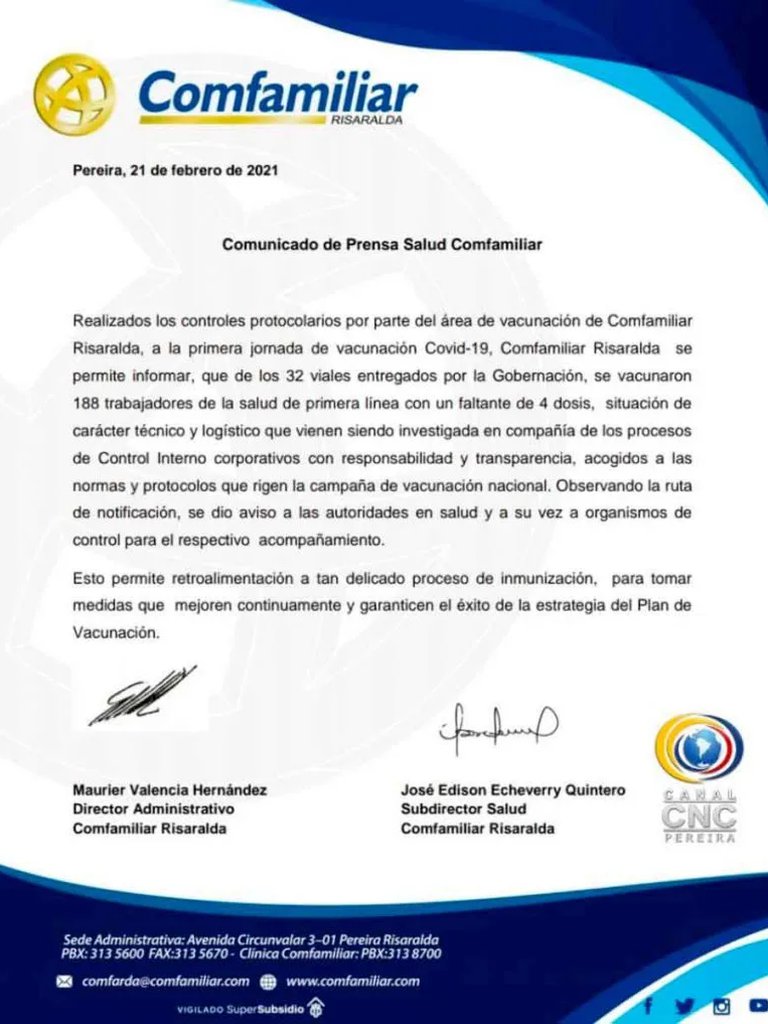 Por medio de un comunicado, la clínica Comfamiliar de Pereira denunció que, en esa ciudad, desaparecieron cuatro dosis de la vacuna de Pfizer contra el covid-19. De acuerdo con la IPS, en la capital de Risaralda se entregaron 32 viales que, de a seis dosis, alcanzarían para vacunar a 192 profesionales de la salud; sin embargo, solo se logró vacunar a 188, ya que a la clínica llegaron incompletas las dosis de vacunación contra el COVID-19.