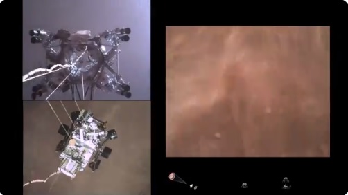El video también captura la caída del escudo térmico después de proteger a Perseverance de temperaturas abrasadoras durante su entrada a la atmósfera marciana. La vista hacia abajo desde el rover se balancea suavemente como un péndulo mientras la etapa de descenso, con la perseverancia adjunta, cuelga de la carcasa trasera y el paracaídas. El paisaje marciano se lanza rápidamente a medida que la etapa de descenso, el «jetpack» de vuelo libre del rover, que desacelera usando motores de cohetes y luego baja el rover con cables a la superficie, se libera, sus ocho propulsores se activan para poner distancia entre él y el ahora -Cubierta trasera descartada y el paracaídas.