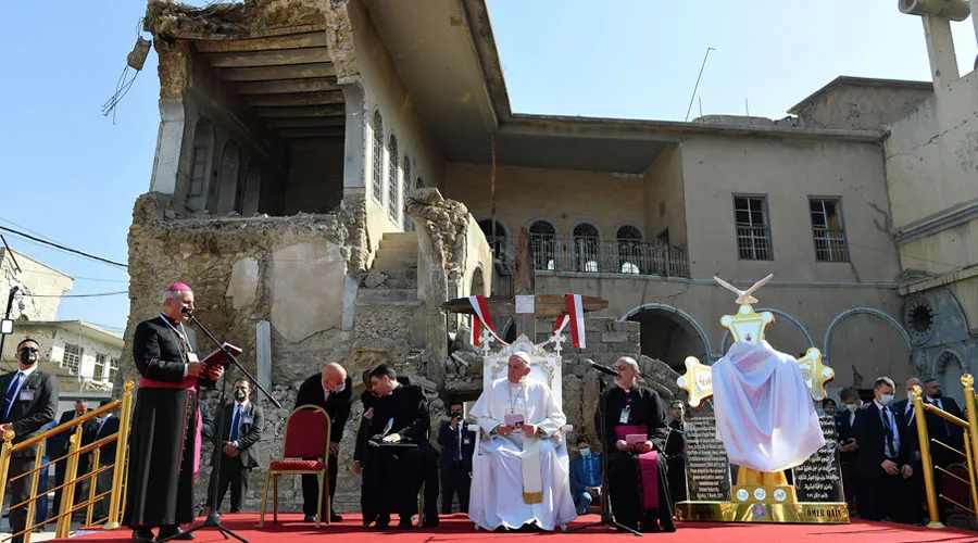 En la devastada Mosul, rodeado de escombros y ante las cuatro iglesias cristianas destrozadas de la plaza Hosh al Bieaa, donde una vez jugaban los niños cristianos y musulmanes, Francisco rezó por las víctimas de todas las guerras en su tercer día de visita al país árabe.