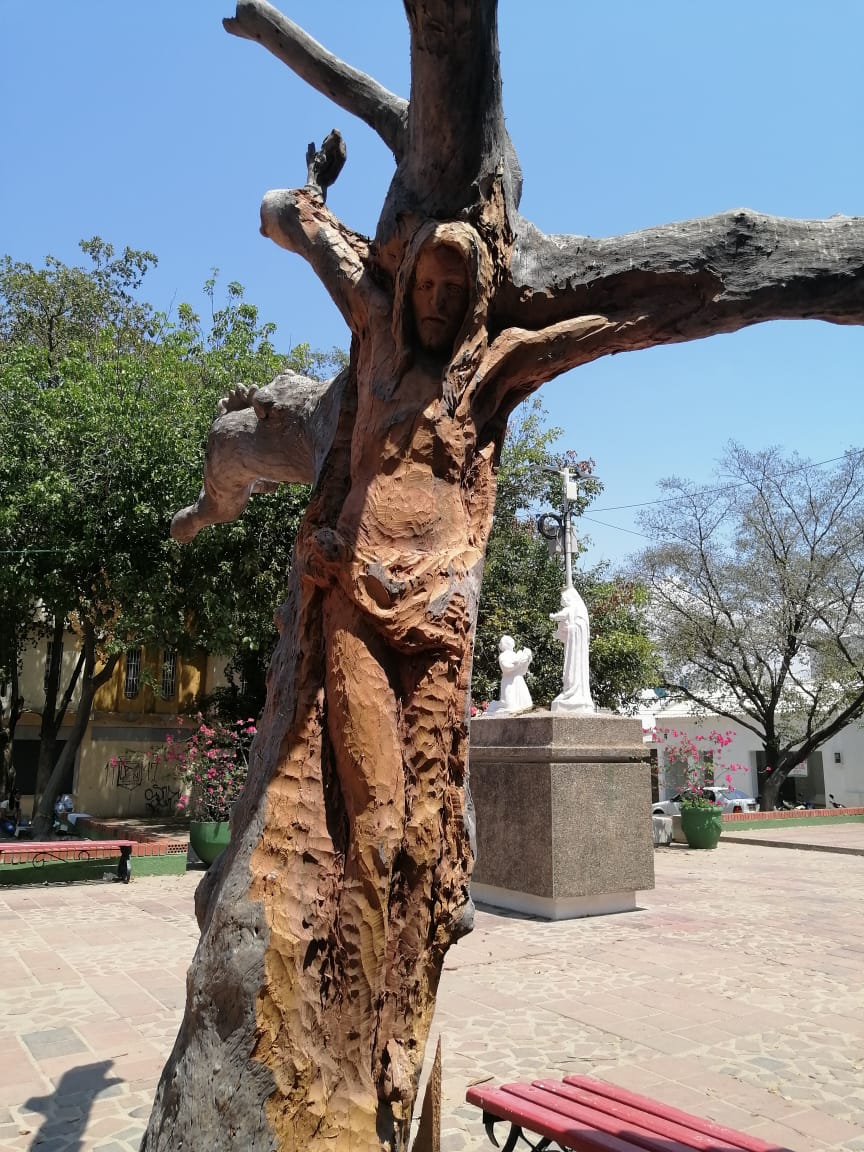 Un emblemático árbol de almendro, de aproximadamente tres metros de altura, con su tallo seco pero perfecto para tallar a Jesús sacrificado en la Cruz, fue tomado por Pedro Antonio Ariza Durán, un hombre de 45 años, de origen vallenato, que ha demostrado ser un artista innato que hoy se ahoga entre la mendicidad y las drogas, pero con el pensamiento lúcido para plasmar, a través del arte, imágenes religiosas.
