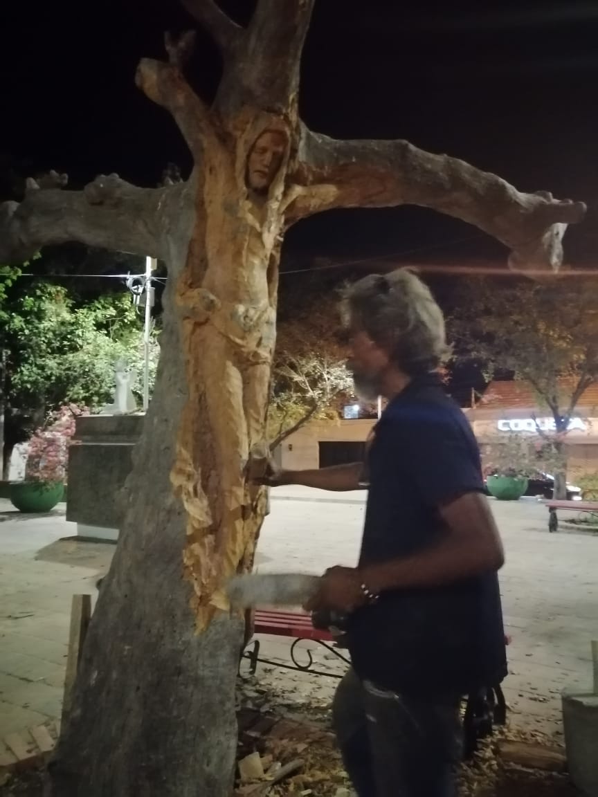 Comenzó tallando solo el rostro de Jesús y así lo dejó. El árbol no llamaba la atención de nadie y pasaba desapercibido para quienes a diario circulan por el parque. Pero Pedro seguía pasando día y noche por el lugar, quizás planificando lo que en el debido momento pretendía desarrollar; y así fue, hace dos semanas aproximadamente puso manos a la obra, a su manera, pero con la firme convicción de regalarle a la ciudad la imagen de Dios como reflejo de protección para el pueblo.