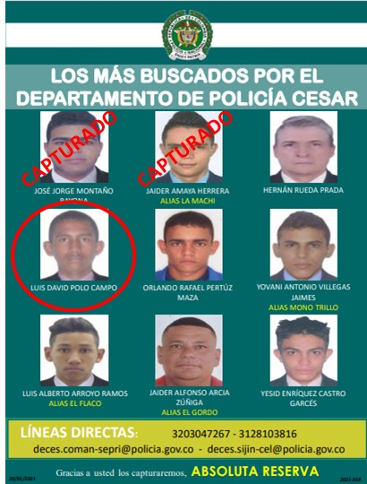 Con este son tres los capturados del cartel de los más buscados en el Cesar; los anteriores fueron José Jorge Montaño y Jaider Maya.