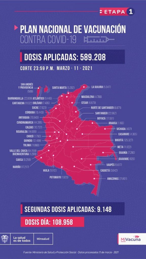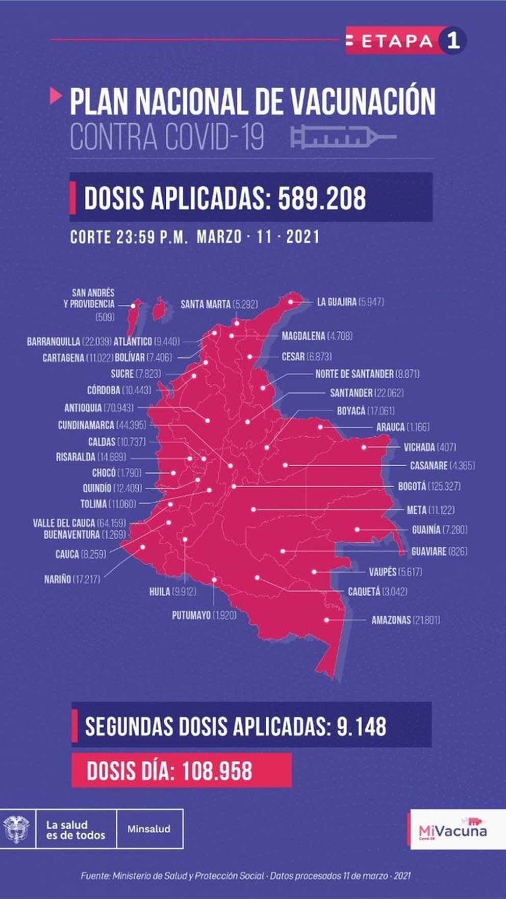 Avanza el Plan Nacional de Vacunación contra el covid-19 en Colombia y, de acuerdo con las últimas cifras que publicó el Ministerio de Salud, este jueves 11 de marzo se aplicaron 108.958 dosis de vacunas contra el virus.