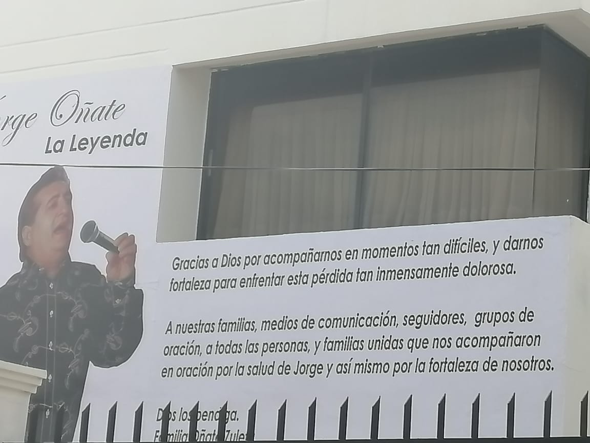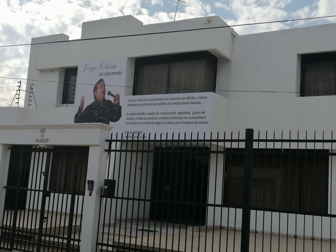 “Gracias a Dios por acompañarnos en momentos tan difíciles y darnos fortaleza para enfrentar esta pérdida inmensamente dolorosa…”, es uno de los mensajes que en un gran aviso luce en la fachada de la residencia de ‘El Jilguero de América’, Jorge Oñate, en el municipio de La Paz, Cesar, como un gesto de agradecimiento de sus familiares por el acompañamiento durante el duro momento.