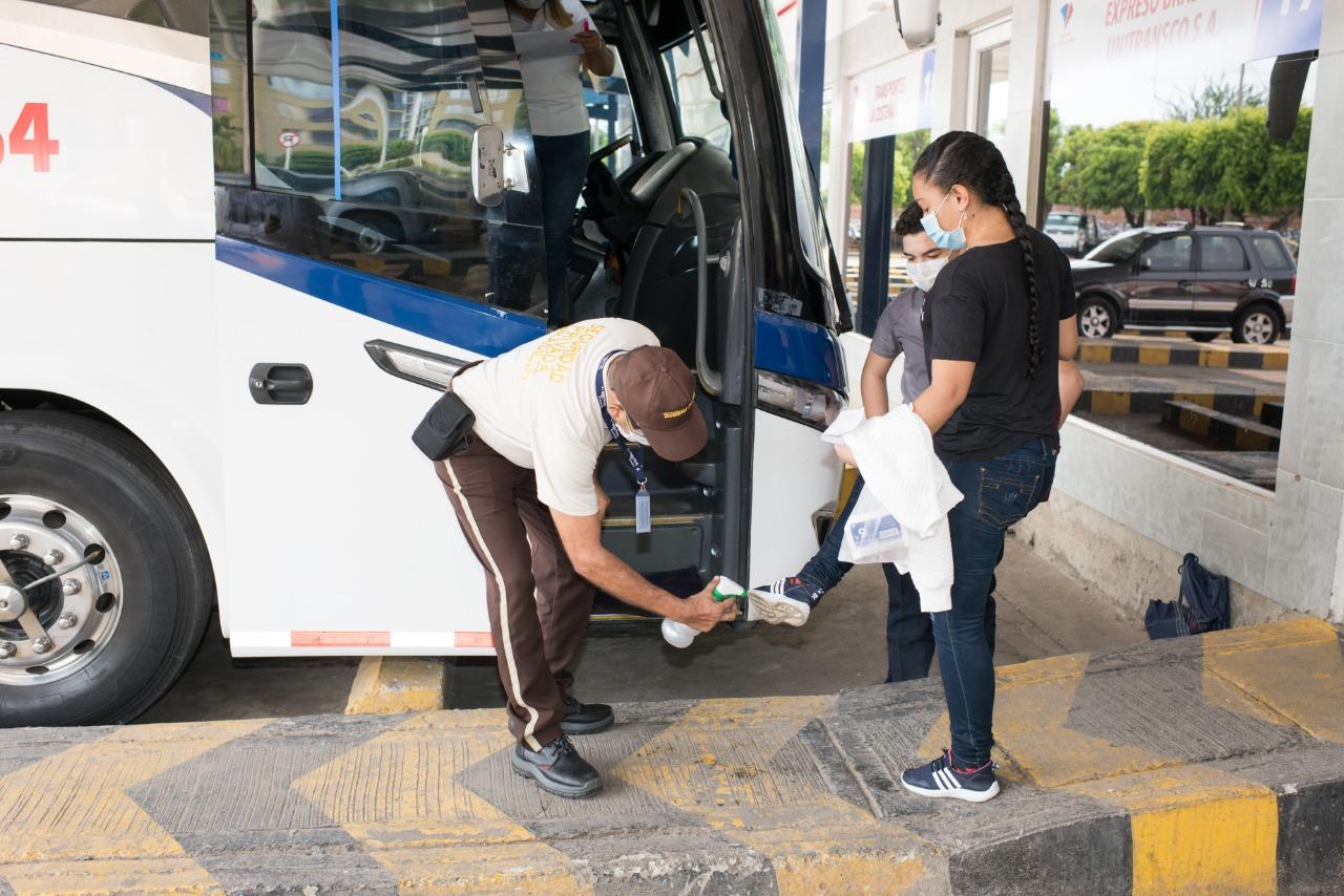 En la terminal se instalaron seis puntos de desinfección, además de exigir el uso del tapabocas. También se desinfecta la sala de abordaje dos veces al día y durante el abordaje de los buses se cumplen estrictos protocolos de bioseguridad.