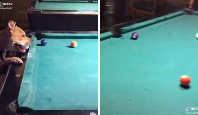 El can toma la bola blanca con su boca, la que que reglamentariamente debe usarse para empujar a las demás hacia los agujeros de la mesa. Luego de unos segundos de ver la mesa, y lo que parece ser analizar la jugada, el animal se dispuso a lanzar la bola.