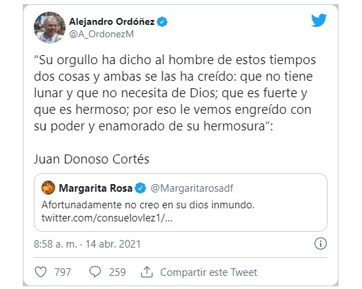 Una de las respuestas que llamó la atención fue la del exprocurador y actual embajador ante la OEA Alejandro Ordóñez, quien compartió una cita del filósofo español Juan Donoso Cortés.
